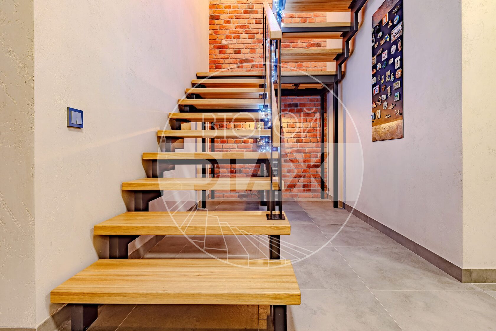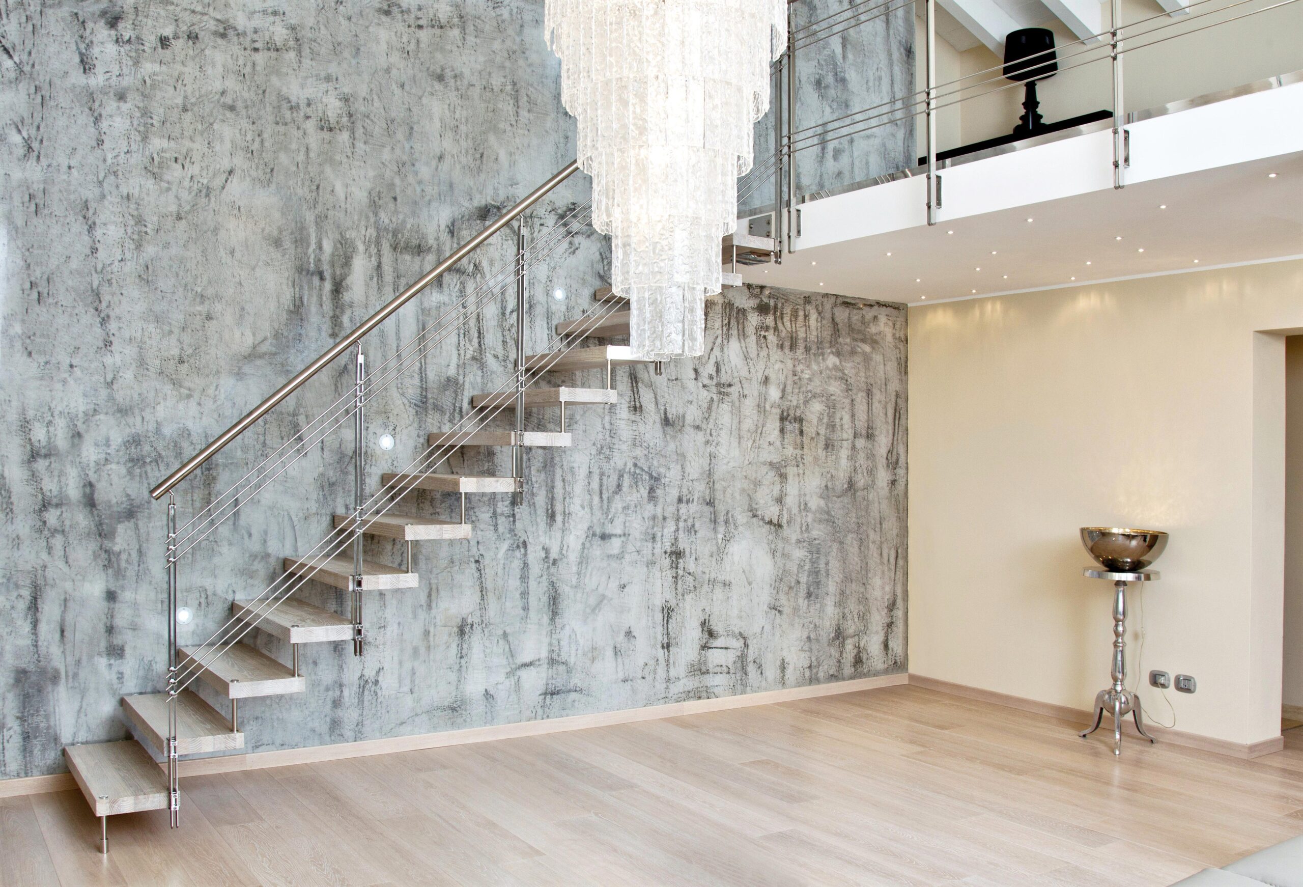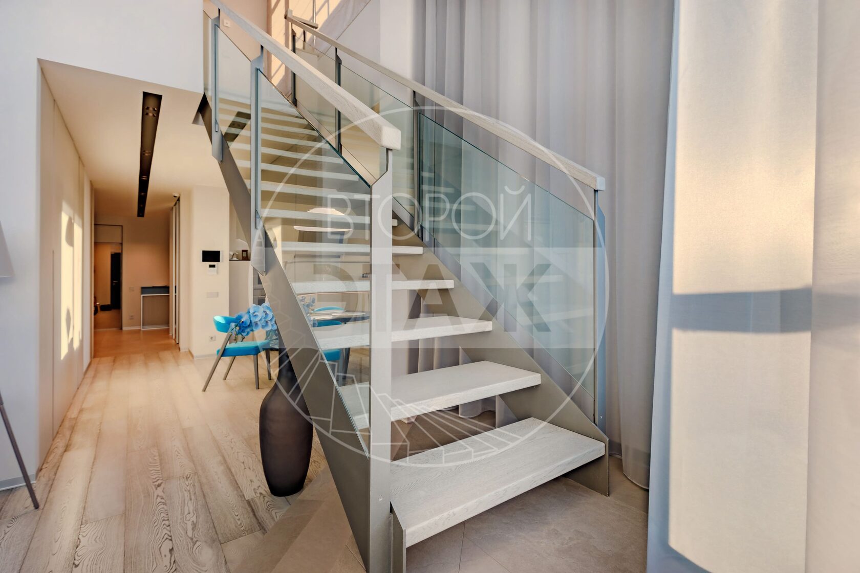 Благодаря особой системе крепления на болты, лестница выглядит легкой. Отсутствие тетив и косоуров позволяет выиграть пространство, а прочность обеспечивается за счет крепежа к стене. Конструкция подходит для помещений с ограниченными габаритами.