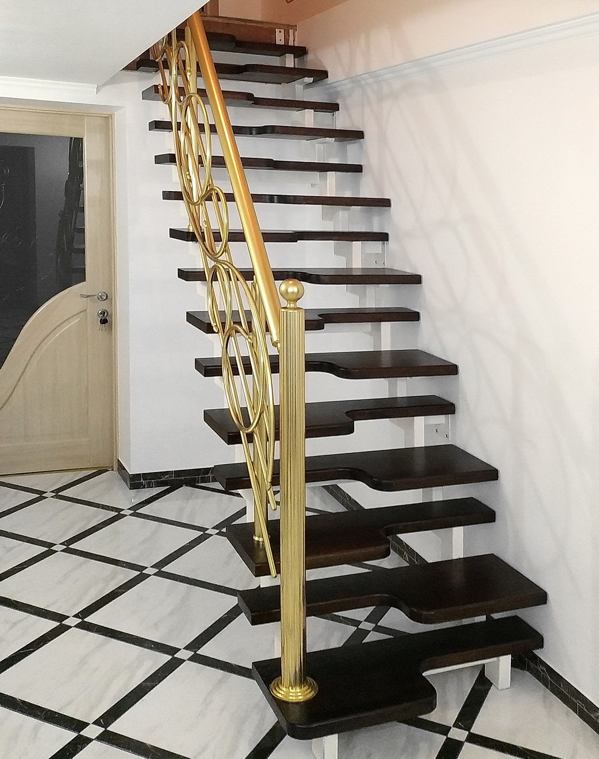 Этот вариант разработан специально для помещений с ограниченной площадью. Особая форма ступеней позволяет уменьшить пролет без потери удобства. Высота подступенка чаще выше стандартной, но за счет чередующихся вырезов подниматься легче. При правильном проектировании такой вариант занимает минимальное место.